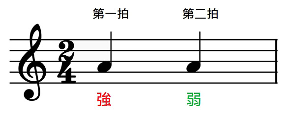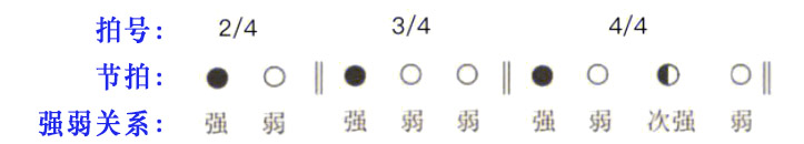 2/4拍:以4分音符为一拍,每小节2拍、有2个4分音符(或等效的音符组合,下同)。强、弱。