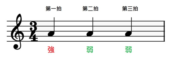 3/4拍:以4分音符为一拍,每小节3拍、有3个4分音符。强、弱、弱。