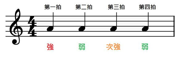 4/4拍:以4分音符为一拍,每小节4拍、有4个4分音符。强、弱、次强、弱。